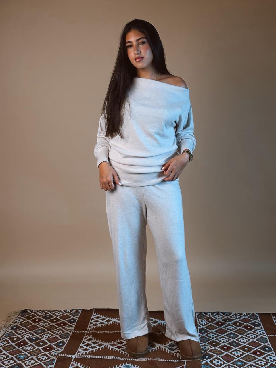A cozy, relaxed-fit set designed with a subtle one-shoulder reveal for effortless chic.