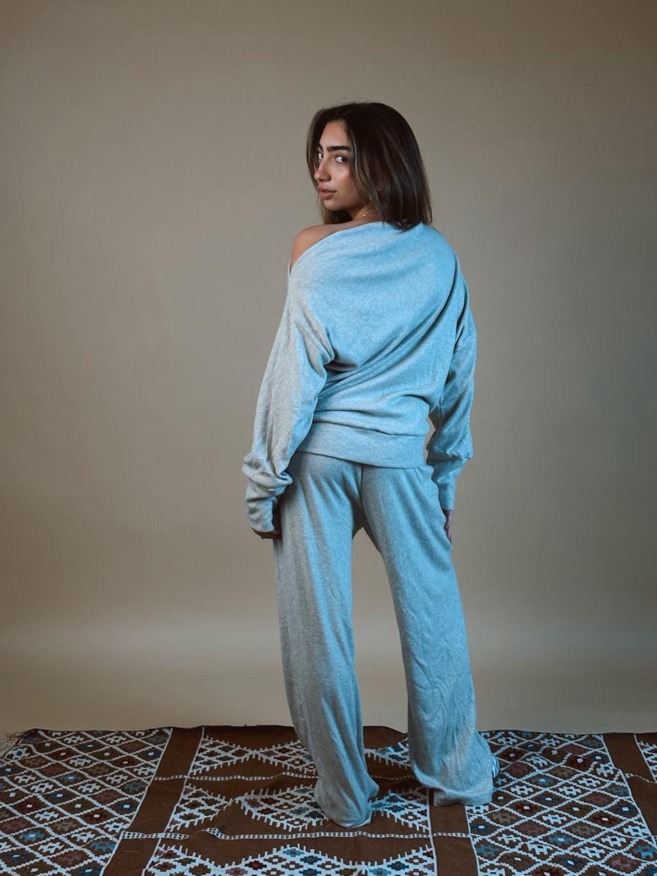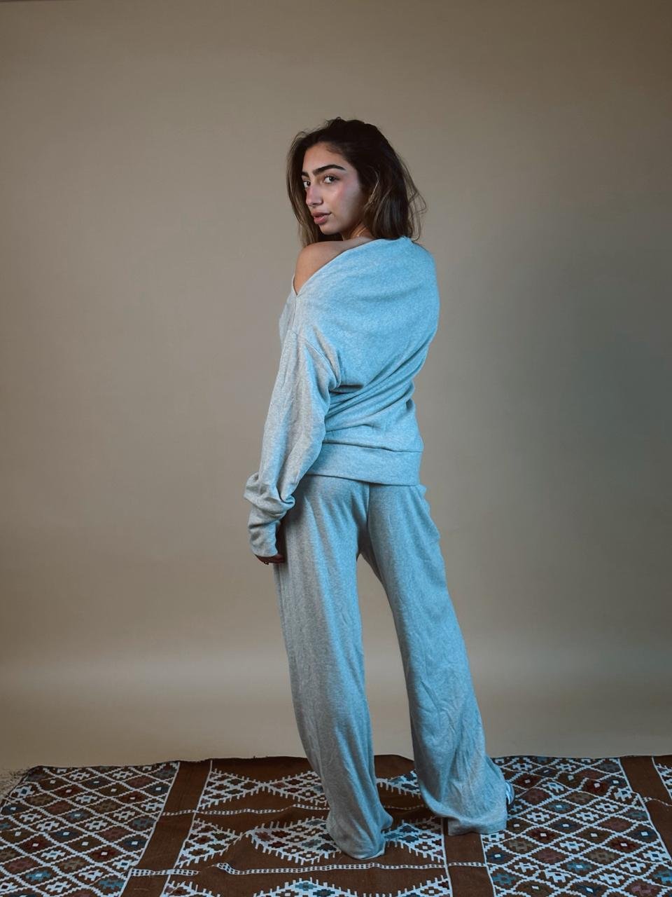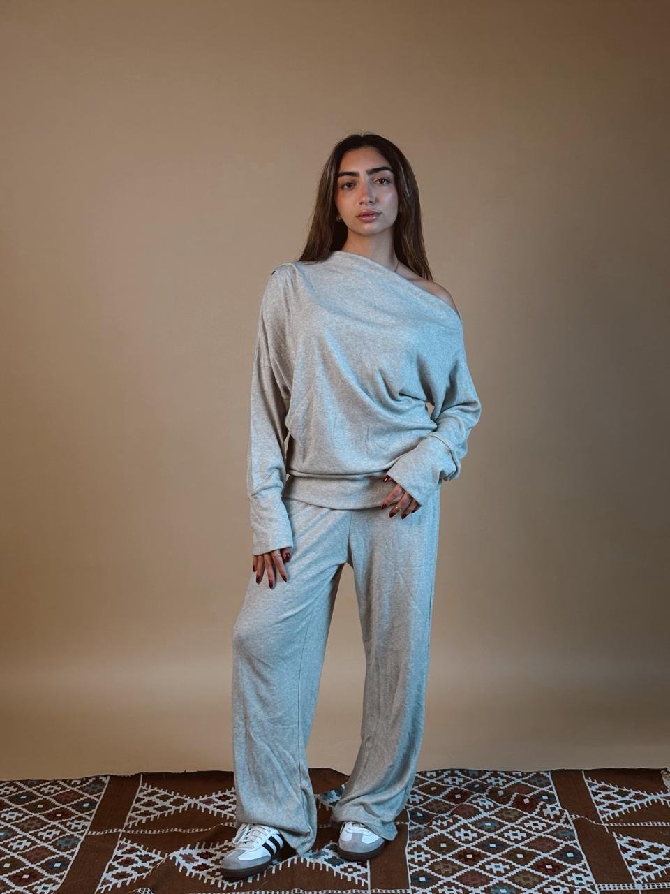 A cozy, relaxed-fit set designed with a subtle one-shoulder reveal for effortless chic.